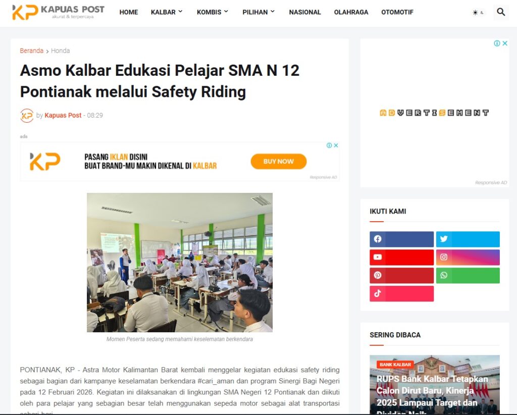 Asmo Kalbar Edukasi Pelajar SMA N 12 Pontianak melalui Safety Riding by Muhammad Arif 23 Februari 2026 in Silahkan kunjungi https://www.kapuaspost.web.id/2026/02/asmo-kalbar-edukasi-pelajar-sma-n-12.html. Tags: astra Astra Motor kalbar Astra Motor Pontianak astramotor honda kalbar pontianak sepeda motor You Might Like Regional Public Launching New ADV160 The SUV Pride Grand Launching New PCX 160 Truly Exceptional! Tetap hati-hati ya bro sist berkendara saat hujan.