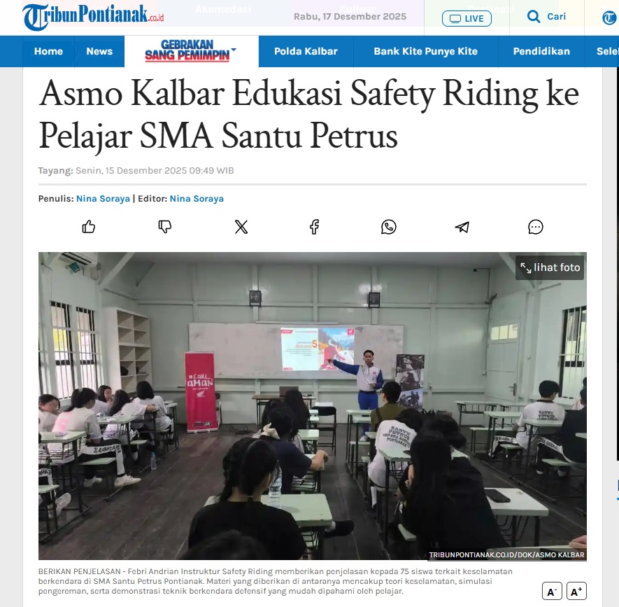 Asmo Kalbar Edukasi Safety Riding ke Pelajar SMA Santu Petrus by Nina Soraya 15 Desember 2025 in Silahkan kunjungi https://pontianak.tribunnews.com/metropolis/1154329/asmo-kalbar-edukasi-safety-riding-ke-pelajar-sma-santu-petrus. You Might Like Regional Public Launching New ADV160 The SUV Pride Grand Launching New PCX 160 Truly Exceptional! Tetap hati-hati ya bro sist berkendara saat hujan.