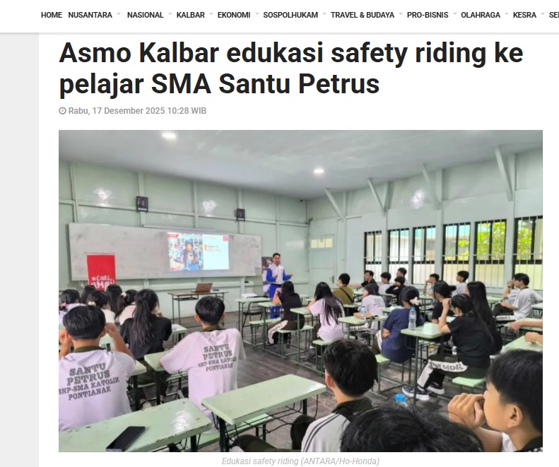 Asmo Kalbar edukasi safety riding ke pelajar SMA Santu Petrus by Dedi 17 Desember 2025 in Silahkan kunjungi https://kalbar.antaranews.com/berita/678358/asmo-kalbar-edukasi-safety-riding-ke-pelajar-sma-santu-petrus. You Might Like Regional Public Launching New ADV160 The SUV Pride Grand Launching New PCX 160 Truly Exceptional! Tetap hati-hati ya bro sist berkendara saat hujan.