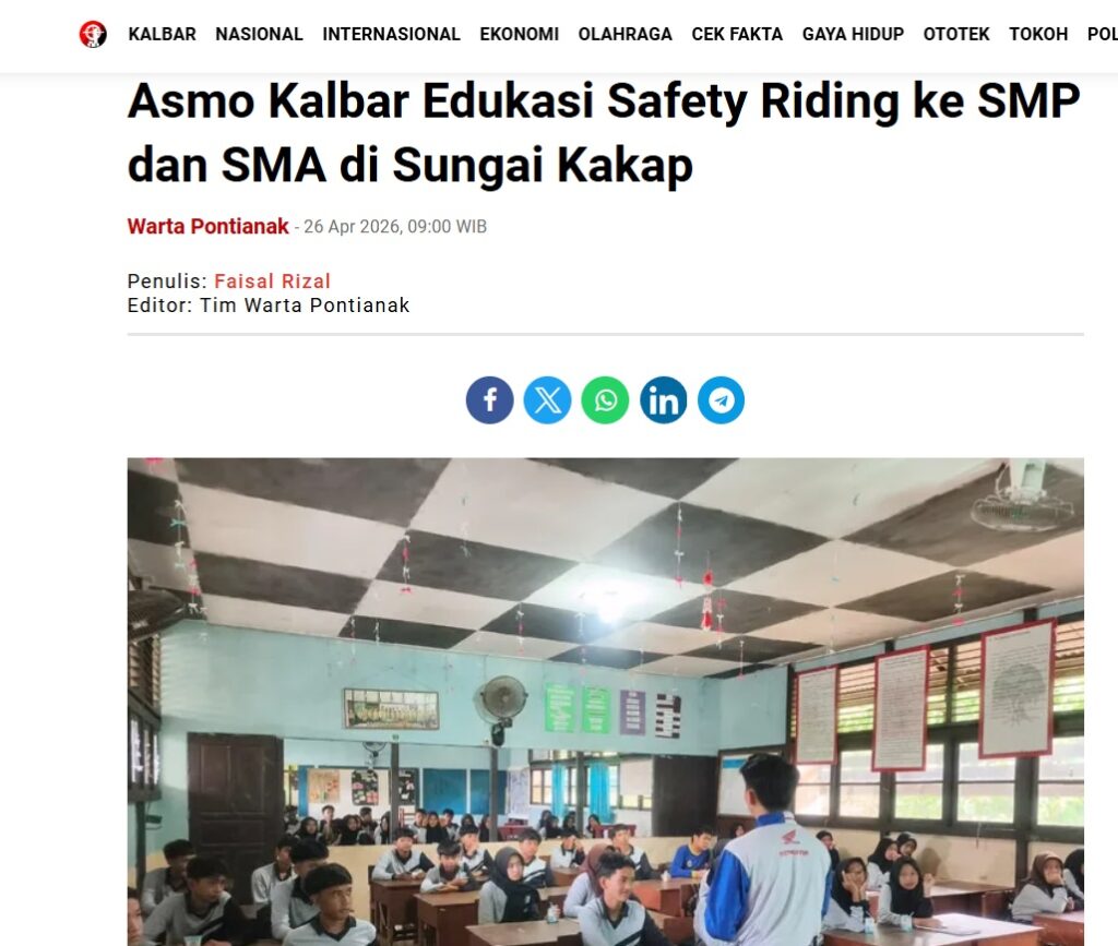 Asmo Kalbar Edukasi Safety Riding ke SMP dan SMA di Sungai Kakap by Faisal Rizal 26 April 2026 in Silahkan kunjungi https://wartapontianak.pikiran-rakyat.com/gaya-hidup/pr-11710166213/asmo-kalbar-edukasi-safety-riding-ke-smp-dan-sma-di-sungai-kakap. You Might Like Regional Public Launching New ADV160 The SUV Pride Grand Launching New PCX 160 Truly Exceptional! Tetap hati-hati ya bro sist berkendara saat hujan.