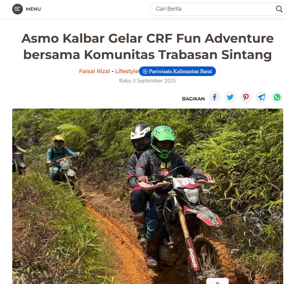 Asmo Kalbar Gelar CRF Fun Adventure bersama Komunitas Trabasan Sintang by Dodi Dodi 3 September 2025 in Silahkan kunjungi https://harianberkat.com/2025/09/03/asmo-kalbar-gelar-crf-fun-adventure-bersama-komunitas-trabasan-sintang/. You Might Like Regional Public Launching New ADV160 The SUV Pride Grand Launching New PCX 160 Truly Exceptional! Tetap hati-hati ya bro sist berkendara saat hujan.