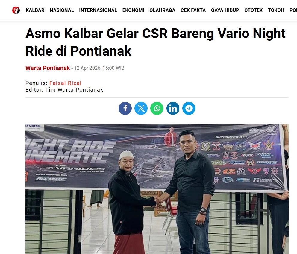 Asmo Kalbar Gelar CSR Bareng Vario Night Ride di Pontianak by Faisal Rizal 12 April 2026 in Silahkan kunjungi https://wartapontianak.pikiran-rakyat.com/gaya-hidup/pr-11710134479/asmo-kalbar-gelar-csr-bareng-vario-night-ride-di-pontianak. You Might Like Regional Public Launching New ADV160 The SUV Pride Grand Launching New PCX 160 Truly Exceptional! Tetap hati-hati ya bro sist berkendara saat hujan.