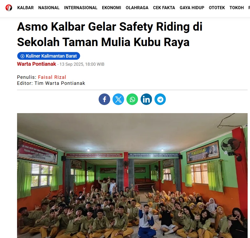 Asmo Kalbar Gelar Safety Riding di Sekolah Taman Mulia Kubu Raya by Faisal Rizal 13 September 2025 in Silahkan kunjungi https://wartapontianak.pikiran-rakyat.com/gaya-hidup/pr-1179642709/asmo-kalbar-gelar-safety-riding-di-sekolah-taman-mulia-kubu-raya. You Might Like Regional Public Launching New ADV160 The SUV Pride Grand Launching New PCX 160 Truly Exceptional! Tetap hati-hati ya bro sist berkendara saat hujan.