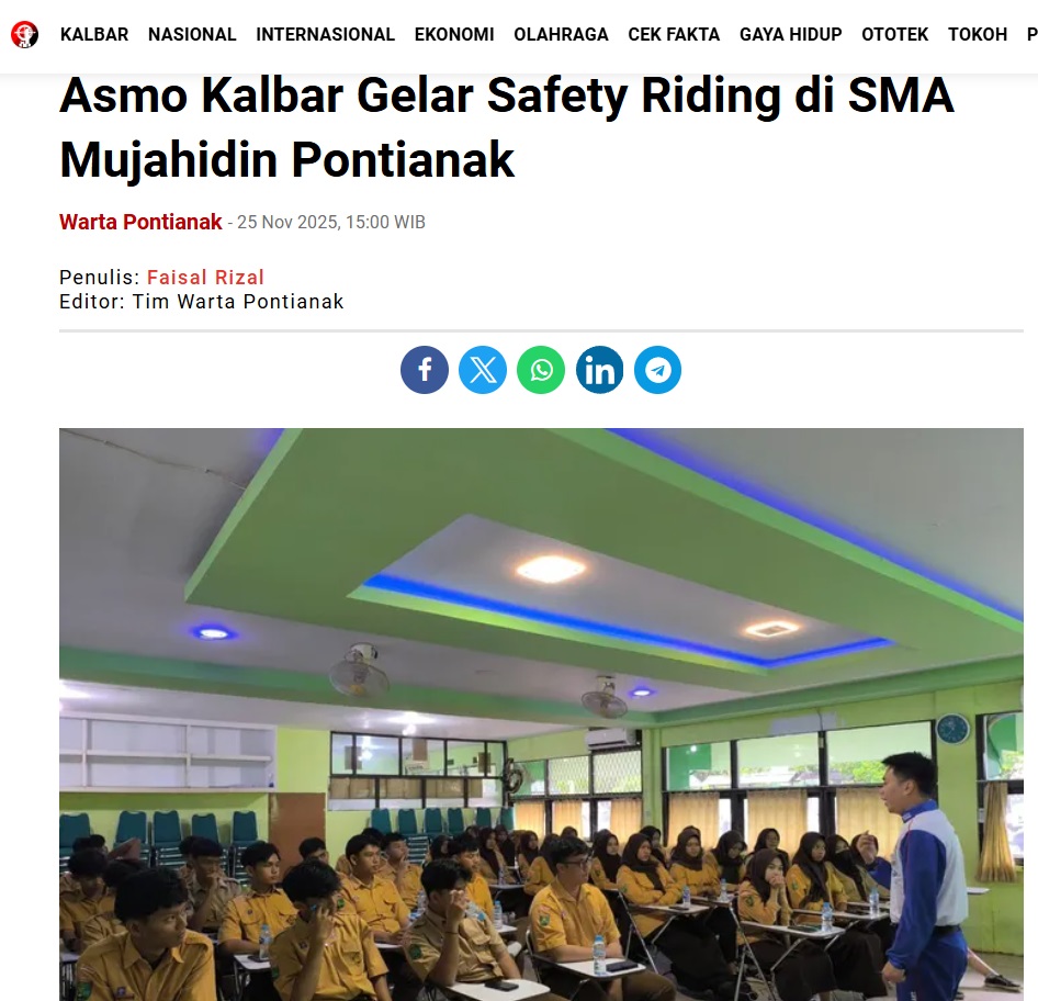 Asmo Kalbar Gelar Safety Riding di SMA Mujahidin Pontianak by Faisal Rizal 25 November 2025 in Silahkan kunjungi https://wartapontianak.pikiran-rakyat.com/gaya-hidup/pr-1179815570/asmo-kalbar-gelar-safety-riding-di-sma-mujahidin-pontianak. You Might Like Regional Public Launching New ADV160 The SUV Pride Grand Launching New PCX 160 Truly Exceptional! Tetap hati-hati ya bro sist berkendara saat hujan.