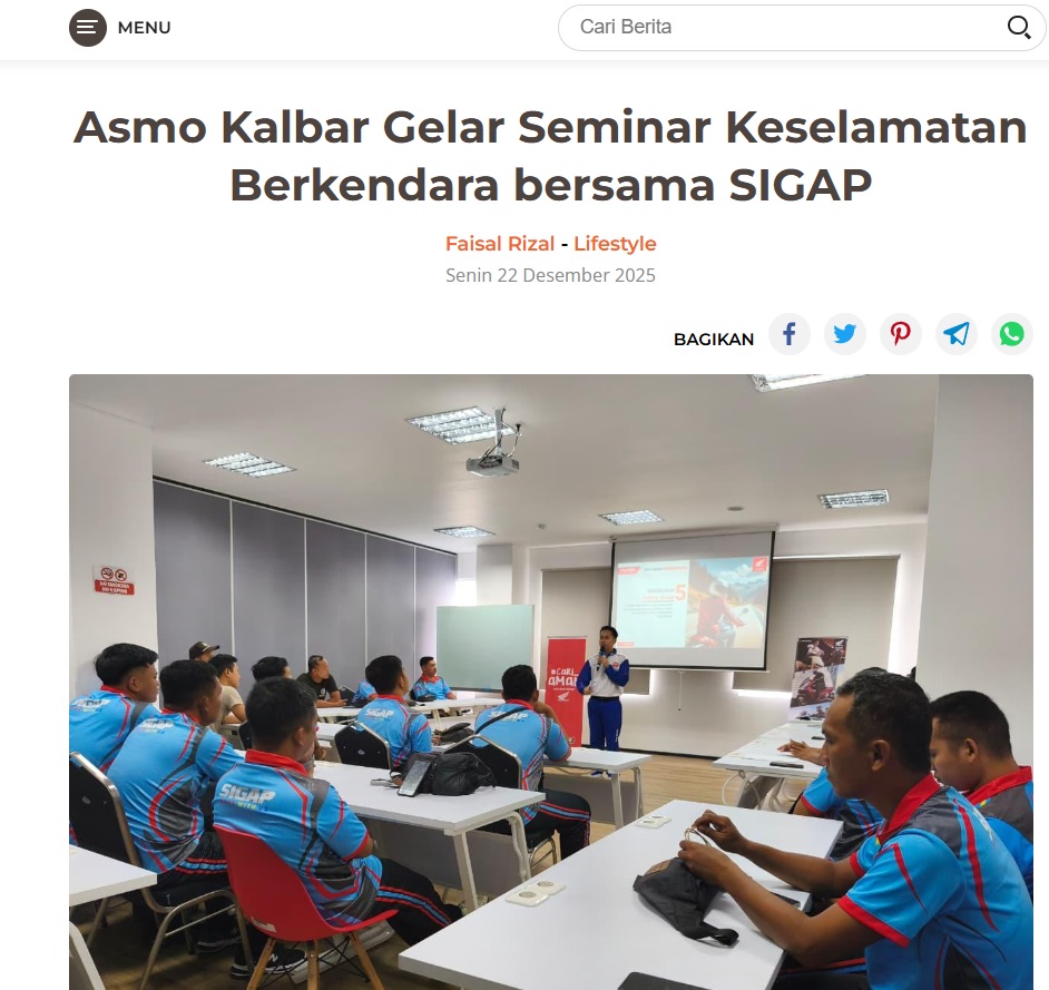 Asmo Kalbar Gelar Seminar Keselamatan Berkendara bersama SIGAP by Dodi Dodi 22 Desember 2025 in Silahkan kunjungi https://harianberkat.com/2025/12/22/asmo-kalbar-gelar-seminar-keselamatan-berkendara-bersama-sigap/. You Might Like Regional Public Launching New ADV160 The SUV Pride Grand Launching New PCX 160 Truly Exceptional! Tetap hati-hati ya bro sist berkendara saat hujan.