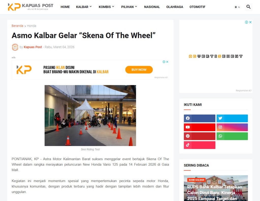 Asmo Kalbar Gelar “Skena Of The Wheel” by Muhammad Arif 4 Maret 2026 in Silahkan kunjungi https://www.kapuaspost.web.id/2026/03/asmo-kalbar-gelar-skena-of-wheel.html. Tags: astra Astra Motor kalbar Astra Motor Pontianak astramotor honda kalbar pontianak sepeda motor You Might Like Regional Public Launching New ADV160 The SUV Pride Grand Launching New PCX 160 Truly Exceptional! Tetap hati-hati ya bro sist berkendara saat hujan.
