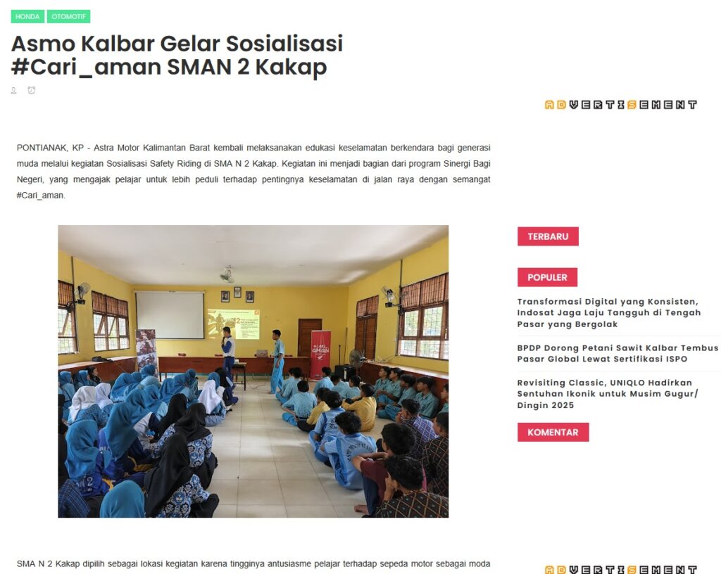 Asmo Kalbar Gelar Sosialisasi #Cari_aman SMAN 2 Kakap by Muhammad Arif 21 Agustus 2025 in Silahkan kunjungi https://www.kapuaspost.web.id/2025/08/asmo-kalbar-gelar-sosialisasi-cariaman.html. Tags: astra Astra Motor kalbar Astra Motor Pontianak astramotor honda kalbar pontianak sepeda motor You Might Like Regional Public Launching New ADV160 The SUV Pride Grand Launching New PCX 160 Truly Exceptional! Tetap hati-hati ya bro sist berkendara saat hujan.
