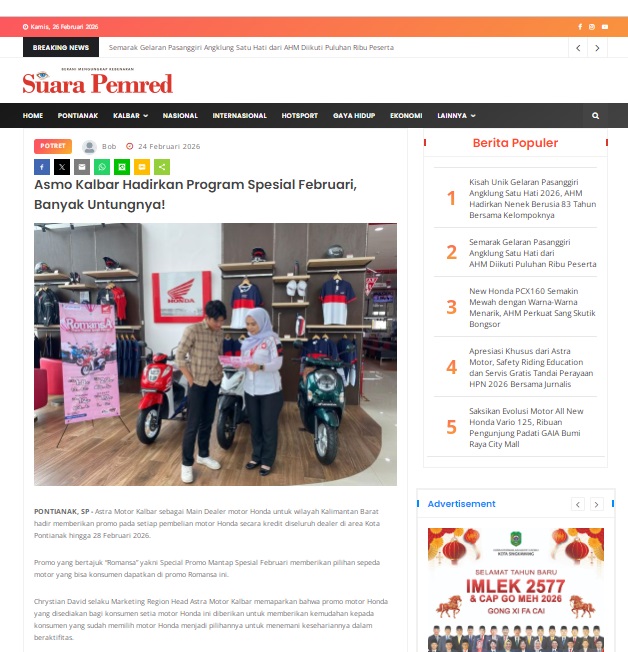 Asmo Kalbar Hadirkan Program Spesial Februari, Banyak Untungnya! by masmul 24 Februari 2026 in Silahkan kunjungi https://www.suarapemredkalbar.com/read/potret/24022026/asmo-kalbar-hadirkan-program-spesial-februari-banyak-untungnya. You Might Like Regional Public Launching New ADV160 The SUV Pride Grand Launching New PCX 160 Truly Exceptional! Tetap hati-hati ya bro sist berkendara saat hujan.