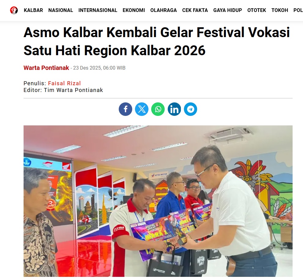 Asmo Kalbar Kembali Gelar Festival Vokasi Satu Hati Region Kalbar 2026 by Faisal Rizal 23 Desember 2025 in Silahkan kunjungi https://wartapontianak.pikiran-rakyat.com/gaya-hidup/pr-1179881330/asmo-kalbar-kembali-gelar-festival-vokasi-satu-hati-region-kalbar-2026. You Might Like Regional Public Launching New ADV160 The SUV Pride Grand Launching New PCX 160 Truly Exceptional! Tetap hati-hati ya bro sist berkendara saat hujan.