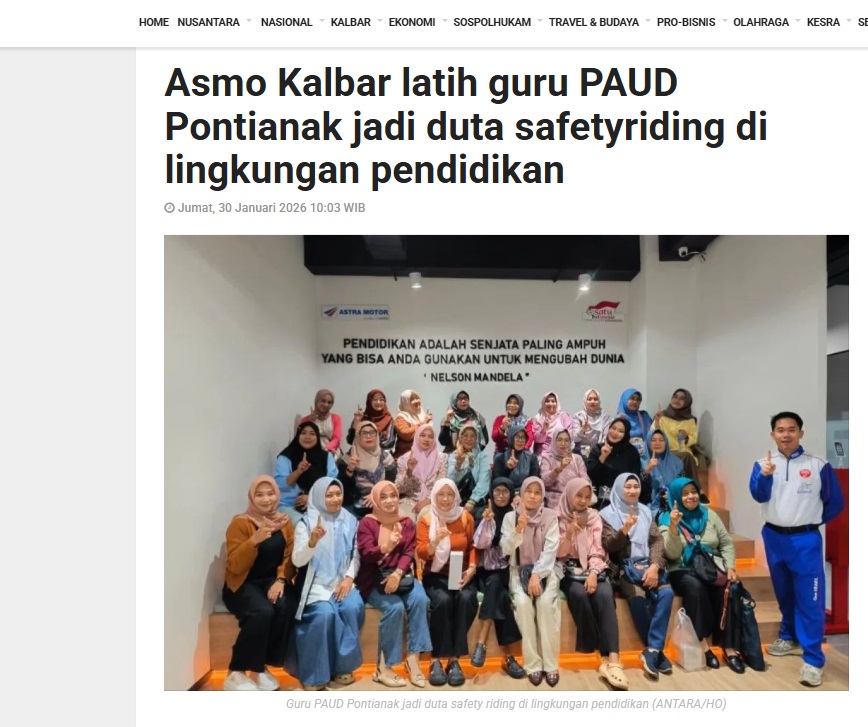 Asmo Kalbar latih guru PAUD Pontianak jadi duta safetyriding di lingkungan pendidikan by Dedi 30 Januari 2026 in Silahkan kunjungi https://kalbar.antaranews.com/berita/686686/asmo-kalbar-latih-guru-paud-pontianak-jadi-duta-safetyriding-di-lingkungan-pendidikan. You Might Like Regional Public Launching New ADV160 The SUV Pride Grand Launching New PCX 160 Truly Exceptional! Tetap hati-hati ya bro sist berkendara saat hujan.