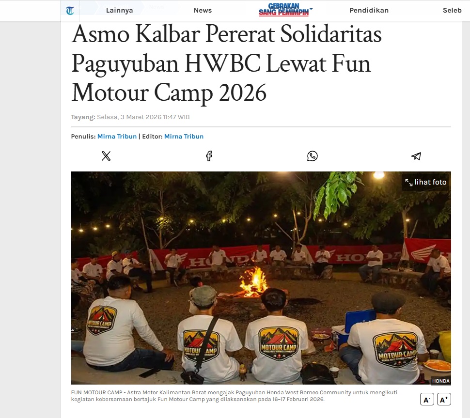 Asmo Kalbar Pererat Solidaritas Paguyuban HWBC Lewat Fun Motour Camp 2026 by Nina Soraya 3 Maret 2026 in Silahkan kunjungi https://pontianak.tribunnews.com/otomotif/1164357/asmo-kalbar-pererat-solidaritas-paguyuban-hwbc-lewat-fun-motour-camp-2026. You Might Like Regional Public Launching New ADV160 The SUV Pride Grand Launching New PCX 160 Truly Exceptional! Tetap hati-hati ya bro sist berkendara saat hujan.