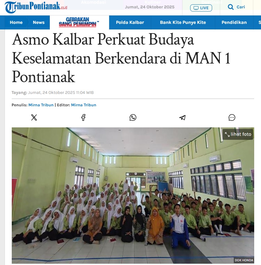 Asmo Kalbar Perkuat Budaya Keselamatan Berkendara di MAN 1 Pontianak by Ishak Ismail 24 Oktober 2025 in Silahkan kunjungi https://pontianak.tribunnews.com/otomotif/1147067/asmo-kalbar-perkuat-budaya-keselamatan-berkendara-di-man-1-pontianak. You Might Like Regional Public Launching New ADV160 The SUV Pride Grand Launching New PCX 160 Truly Exceptional! Tetap hati-hati ya bro sist berkendara saat hujan.