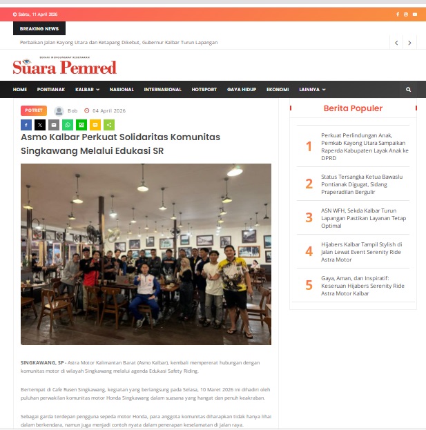 Asmo Kalbar Perkuat Solidaritas Komunitas Singkawang Melalui Edukasi SR by masmul 4 April 2026 in Silahkan kunjungi https://www.suarapemredkalbar.com/read/potret/04042026/asmo-kalbar-perkuat-solidaritas-komunitas-singkawang-melalui-edukasi-sr. You Might Like Regional Public Launching New ADV160 The SUV Pride Grand Launching New PCX 160 Truly Exceptional! Tetap hati-hati ya bro sist berkendara saat hujan.