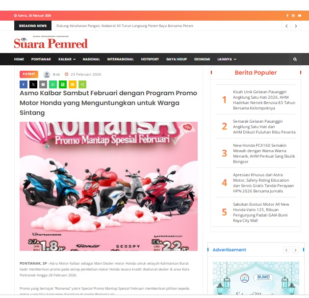 Asmo Kalbar Sambut Februari dengan Program Promo Motor Honda yang Menguntungkan untuk Warga Sintang by masmul 23 Februari 2026 in Silahkan kunjungi https://www.suarapemredkalbar.com/read/potret/23022026/asmo-kalbar-sambut-februari-dengan-program-promo-motor-honda-yang-menguntungkan-untuk-warga-sintang. You Might Like Regional Public Launching New ADV160 The SUV Pride Grand Launching New PCX 160 Truly Exceptional! Tetap hati-hati ya bro sist berkendara saat hujan.