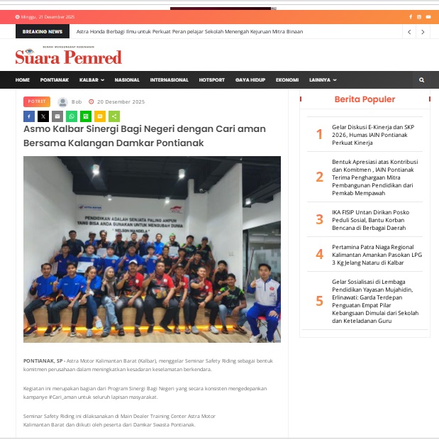 Asmo Kalbar Sinergi Bagi Negeri dengan Cari aman Bersama Kalangan Damkar Pontianak by masmul 20 Desember 2025 in Silahkan kunjungi https://www.suarapemredkalbar.com/read/potret/20122025/asmo-kalbar-sinergi-bagi-negeri-dengan-cari-aman-bersama-kalangan-damkar-pontianak. You Might Like Regional Public Launching New ADV160 The SUV Pride Grand Launching New PCX 160 Truly Exceptional! Tetap hati-hati ya bro sist berkendara saat hujan.