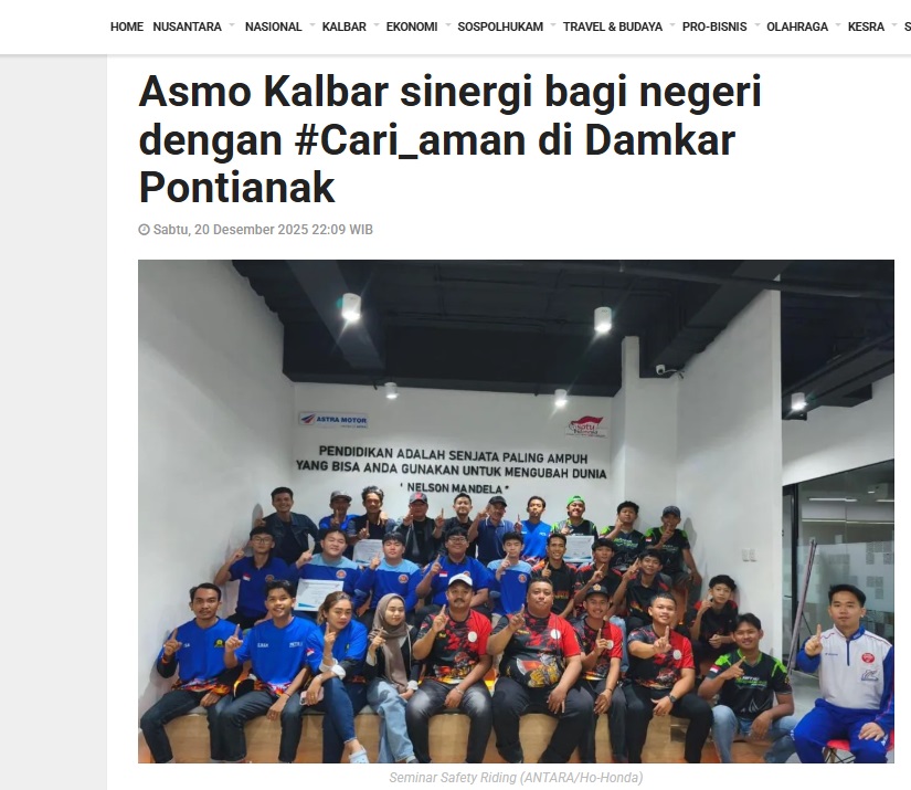 Asmo Kalbar sinergi bagi negeri dengan #Cari_aman di Damkar Pontianak by Dedi 20 Desember 2025 in Silahkan kunjungi https://kalbar.antaranews.com/berita/679072/asmo-kalbar-sinergi-bagi-negeri-dengan-cari-aman-di-damkar-pontianak. You Might Like Regional Public Launching New ADV160 The SUV Pride Grand Launching New PCX 160 Truly Exceptional! Tetap hati-hati ya bro sist berkendara saat hujan.
