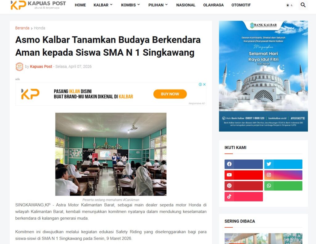 Asmo Kalbar Tanamkan Budaya Berkendara Aman kepada Siswa SMA N 1 Singkawang by Muhammad Arif 7 April 2026 in Silahkan kunjungi https://www.kapuaspost.web.id/2026/04/asmo-kalbar-tanamkan-budaya-berkendara.html. Tags: astra Astra Motor kalbar Astra Motor Pontianak astramotor honda kalbar pontianak sepeda motor You Might Like Regional Public Launching New ADV160 The SUV Pride Grand Launching New PCX 160 Truly Exceptional! Tetap hati-hati ya bro sist berkendara saat hujan.