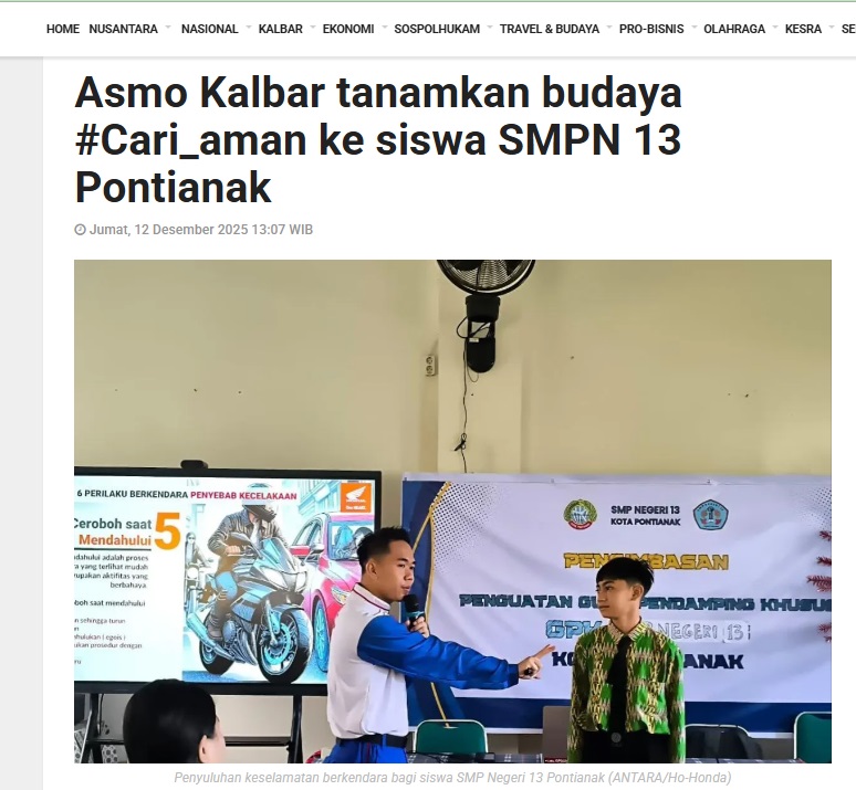 Asmo Kalbar tanamkan budaya #Cari_aman ke siswa SMPN 13 Pontianak by Dedi 12 Desember 2025 in Silahkan kunjungi https://kalbar.antaranews.com/berita/677704/asmo-kalbar-tanamkan-budaya-cari-aman-ke-siswa-smpn-13-pontianak. You Might Like Regional Public Launching New ADV160 The SUV Pride Grand Launching New PCX 160 Truly Exceptional! Tetap hati-hati ya bro sist berkendara saat hujan.