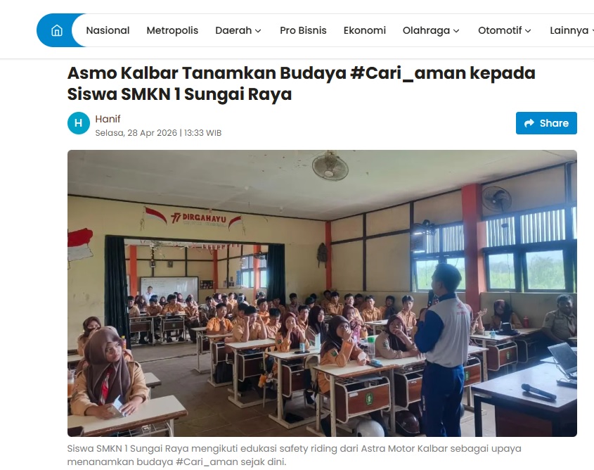Asmo Kalbar Tanamkan Budaya #Cari_aman kepada Siswa SMKN 1 Sungai Raya by Aristono Edi Kiswantoro 28 April 2026 in Silahkan kunjungi https://pontianakpost.jawapos.com/otomotif/2604280044/asmo-kalbar-tanamkan-budaya-cari-aman-kepada-siswa-smkn-1-sungai-raya. You Might Like Regional Public Launching New ADV160 The SUV Pride Grand Launching New PCX 160 Truly Exceptional! Tetap hati-hati ya bro sist berkendara saat hujan.
