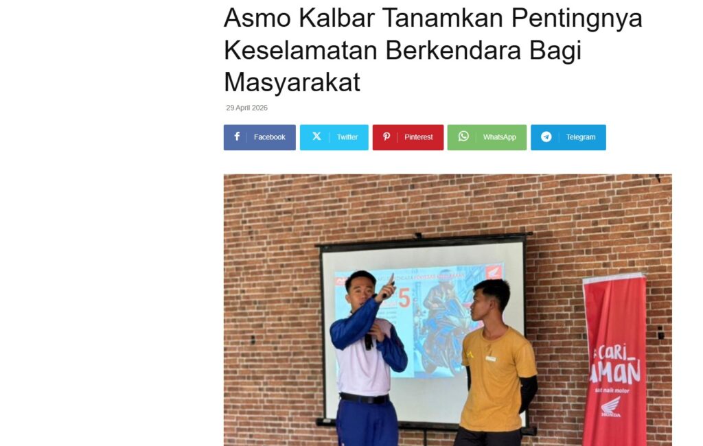 Asmo Kalbar Tanamkan Pentingnya Keselamatan Berkendara Bagi Masyarakat by Nova Sari 29 April 2026 in Silahkan kunjungi https://equator.co.id/asmo-kalbar-tanamkan-pentingnya-keselamatan-berkendara-bagi-masyarakat/. You Might Like Regional Public Launching New ADV160 The SUV Pride Grand Launching New PCX 160 Truly Exceptional! Tetap hati-hati ya bro sist berkendara saat hujan.
