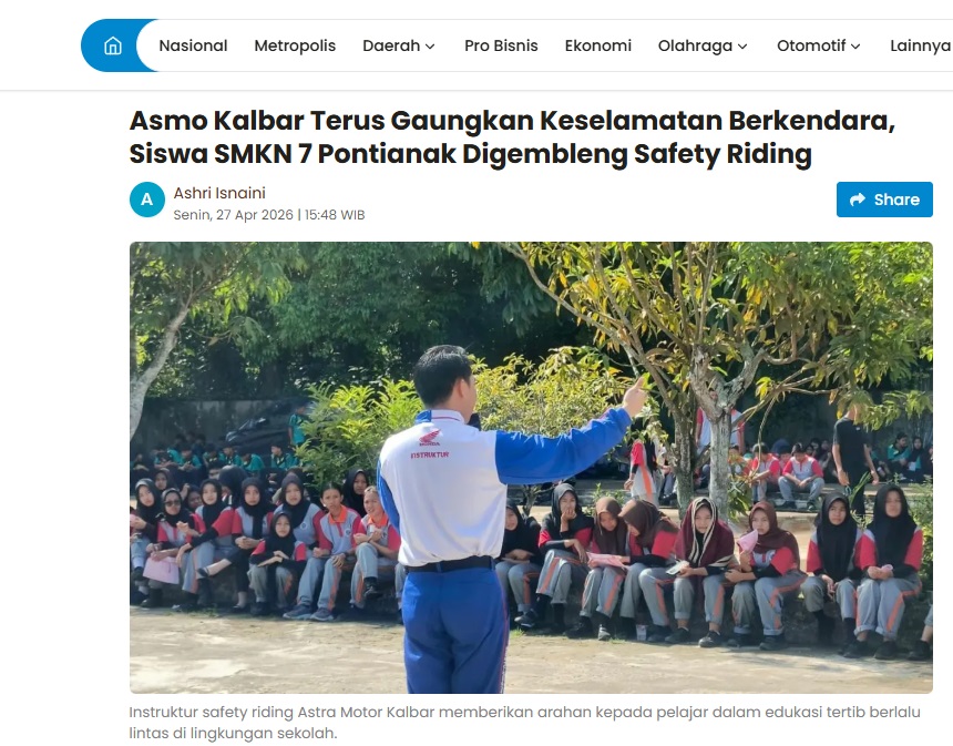 Asmo Kalbar Terus Gaungkan Keselamatan Berkendara, Siswa SMKN 7 Pontianak Digembleng Safety Riding by Aristono Edi Kiswantoro 27 April 2026 in Silahkan kunjungi https://pontianakpost.jawapos.com/otomotif/2604270056/asmo-kalbar-terus-gaungkan-keselamatan-berkendara-siswa-smkn-7-pontianak-digembleng-safety-riding. You Might Like Regional Public Launching New ADV160 The SUV Pride Grand Launching New PCX 160 Truly Exceptional! Tetap hati-hati ya bro sist berkendara saat hujan.