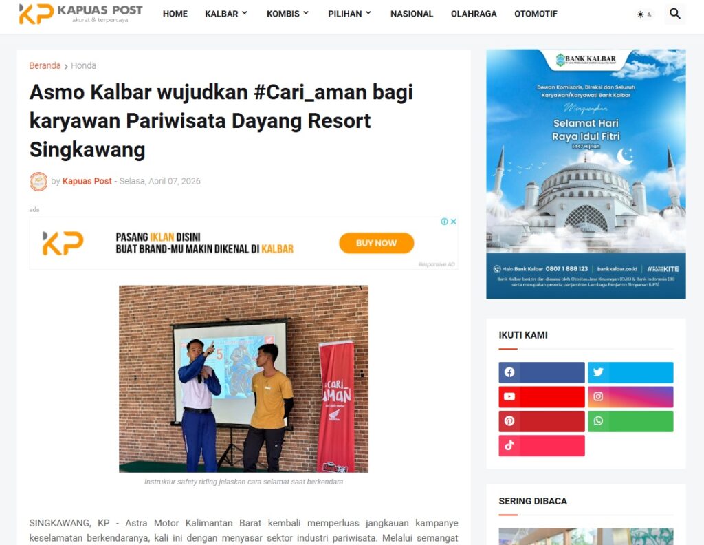 Asmo Kalbar wujudkan #Cari_aman bagi karyawan Pariwisata Dayang Resort Singkawang by Muhammad Arif 7 April 2026 in Silahkan kunjungi https://www.kapuaspost.web.id/2026/04/asmo-kalbar-wujudkan-cariaman-bagi.html. Tags: astra Astra Motor kalbar Astra Motor Pontianak astramotor honda kalbar pontianak sepeda motor You Might Like Regional Public Launching New ADV160 The SUV Pride Grand Launching New PCX 160 Truly Exceptional! Tetap hati-hati ya bro sist berkendara saat hujan.