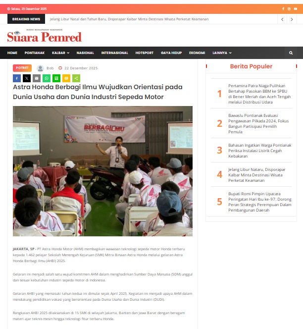 Astra Honda Berbagi Ilmu Wujudkan Orientasi pada Dunia Usaha dan Dunia Industri Sepeda Motor by masmul 22 Desember 2025 in Silahkan kunjungi https://www.suarapemredkalbar.com/read/potret/22122025/astra-honda-berbagi-ilmu-wujudkan-orientasi-pada-dunia-usaha-dan-dunia-industri-sepeda-motor. You Might Like Regional Public Launching New ADV160 The SUV Pride Grand Launching New PCX 160 Truly Exceptional! Tetap hati-hati ya bro sist berkendara saat hujan.