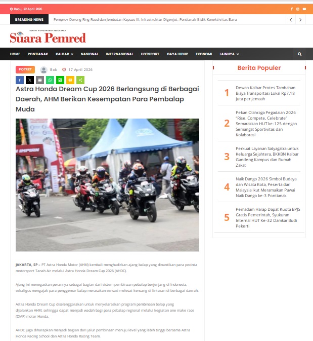 Astra Honda Dream Cup 2026 Berlangsung di Berbagai Daerah, AHM Berikan Kesempatan Para Pembalap Muda by masmul 17 April 2026 in Silahkan kunjungi https://www.suarapemredkalbar.com/read/potret/17042026/astra-honda-dream-cup-2026-berlangsung-di-berbagai-daerah-ahm-berikan-kesempatan-para-pembalap-muda. You Might Like Regional Public Launching New ADV160 The SUV Pride Grand Launching New PCX 160 Truly Exceptional! Tetap hati-hati ya bro sist berkendara saat hujan.