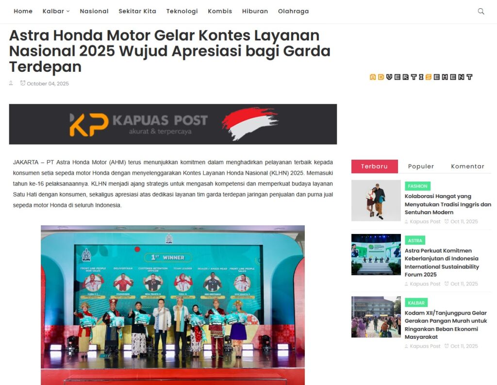 Astra Honda Motor Gelar Kontes Layanan Nasional 2025 Wujud Apresiasi bagi Garda Terdepan by Muhammad Arif 4 Oktober 2025 in Silahkan kunjungi https://www.kapuaspost.web.id/2025/10/astra-honda-motor-gelar-kontes-layanan.html. Tags: astra Astra Motor kalbar Astra Motor Pontianak astramotor honda kalbar pontianak sepeda motor You Might Like Regional Public Launching New ADV160 The SUV Pride Grand Launching New PCX 160 Truly Exceptional! Tetap hati-hati ya bro sist berkendara saat hujan.