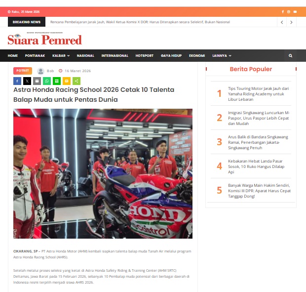 Astra Honda Racing School 2026 Cetak 10 Talenta Balap Muda untuk Pentas Dunia by masmul 16 Maret 2026 in Silahkan kunjungi https://www.suarapemredkalbar.com/read/potret/16032026/astra-honda-racing-school-2026-cetak-10-talenta-balap-muda-untuk-pentas-dunia. You Might Like Regional Public Launching New ADV160 The SUV Pride Grand Launching New PCX 160 Truly Exceptional! Tetap hati-hati ya bro sist berkendara saat hujan.