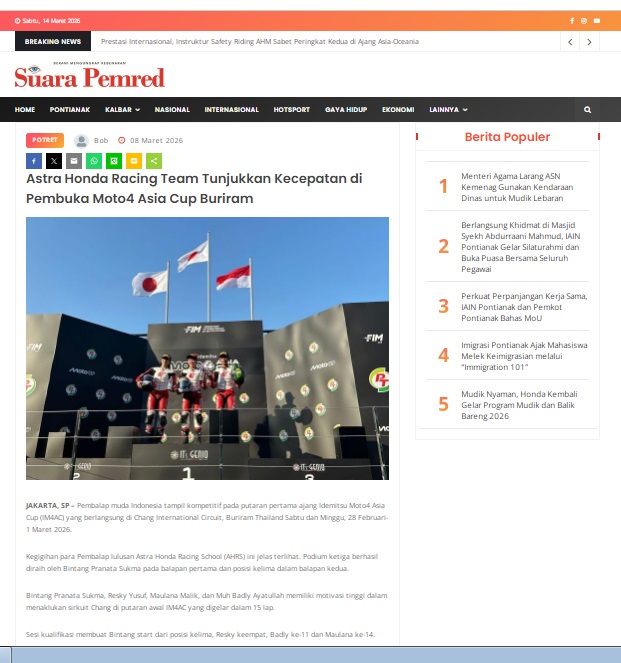 Astra Honda Racing Team Tunjukkan Kecepatan di Pembuka Moto4 Asia Cup Buriram by masmul 8 Maret 2026 in Silahkan kunjungi https://www.suarapemredkalbar.com/read/potret/08032026/astra-honda-racing-team-tunjukkan-kecepatan-di-pembuka-moto4-asia-cup-buriram. You Might Like Regional Public Launching New ADV160 The SUV Pride Grand Launching New PCX 160 Truly Exceptional! Tetap hati-hati ya bro sist berkendara saat hujan.