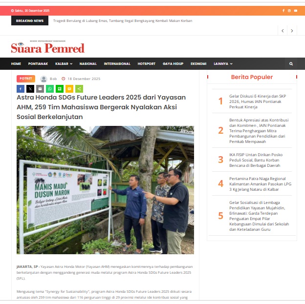 Astra Honda SDGs Future Leaders 2025 dari Yayasan AHM, 259 Tim Mahasiswa Bergerak Nyalakan Aksi Sosial Berkelanjutan by masmul 18 Desember 2025 in Silahkan kunjungi https://www.suarapemredkalbar.com/read/potret/18122025/astra-honda-sdgs-future-leaders-2025-dari-yayasan-ahm-259-tim-mahasiswa-bergerak-nyalakan-aksi-sosial-berkelanjutan. You Might Like Regional Public Launching New ADV160 The SUV Pride Grand Launching New PCX 160 Truly Exceptional! Tetap hati-hati ya bro sist berkendara saat hujan.