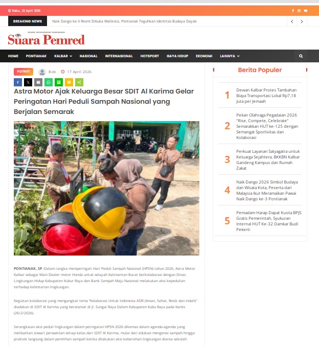 Astra Motor Ajak Keluarga Besar SDIT Al Karima Gelar Peringatan Hari Peduli Sampah Nasional yang Berjalan Semarak by masmul 17 April 2026 in Silahkan kunjungi https://www.suarapemredkalbar.com/read/potret/17042026/astra-motor-ajak-keluarga-besar-sdit-al-karima-gelar-peringatan-hari-peduli-sampah-nasional-yang-berjalan-semarak. You Might Like Regional Public Launching New ADV160 The SUV Pride Grand Launching New PCX 160 Truly Exceptional! Tetap hati-hati ya bro sist berkendara saat hujan.