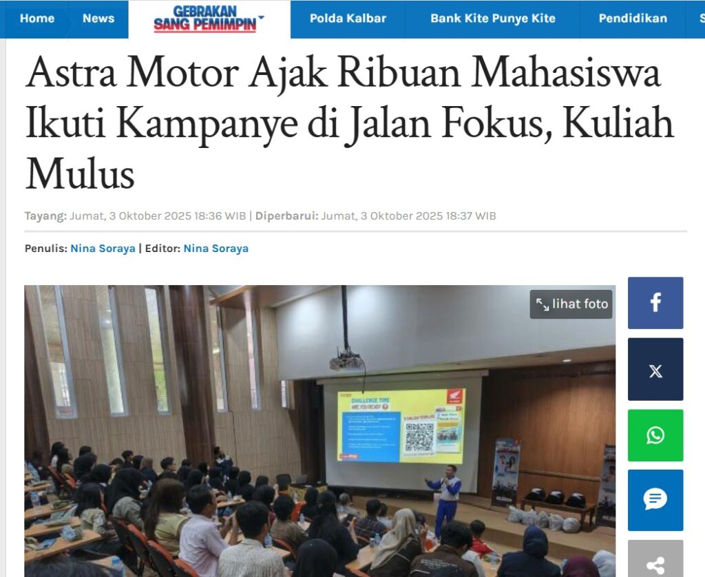 Astra Motor Ajak Ribuan Mahasiswa Ikuti Kampanye di Jalan Fokus, Kuliah Mulus by Ishak Ismail 3 Oktober 2025 in Silahkan kunjungi https://pontianak.tribunnews.com/bisnis/1144239/astra-motor-bareng-ribuan-mahasiswa-ikuti-kampanye-di-jalan-fokus-kuliah-mulus. You Might Like Regional Public Launching New ADV160 The SUV Pride Grand Launching New PCX 160 Truly Exceptional! Tetap hati-hati ya bro sist berkendara saat hujan.