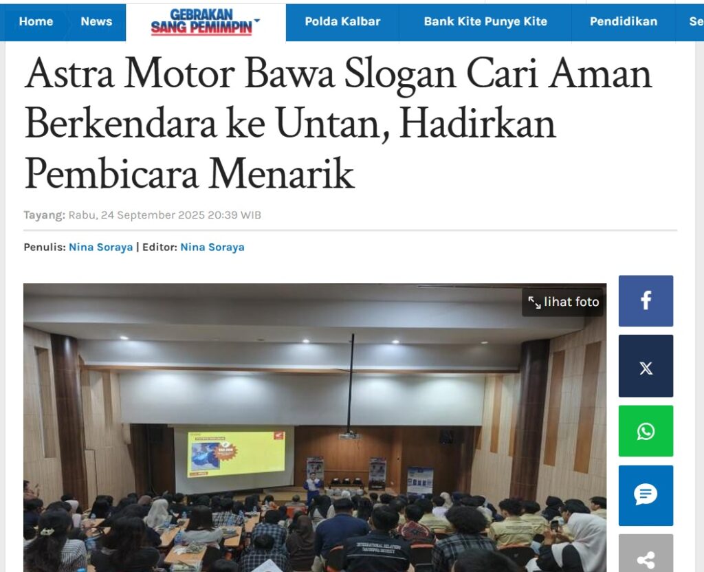 Astra Motor Bawa Slogan Cari Aman Berkendara ke Untan, Hadirkan Pembicara Menarik by Ishak Ismail 24 September 2025 in Silahkan kunjungi https://pontianak.tribunnews.com/metropolis/1142723/astra-motor-bawa-slogan-cari-aman-berkendara-ke-untan-hadirkan-pembicara-menarik. You Might Like Regional Public Launching New ADV160 The SUV Pride Grand Launching New PCX 160 Truly Exceptional! Tetap hati-hati ya bro sist berkendara saat hujan.