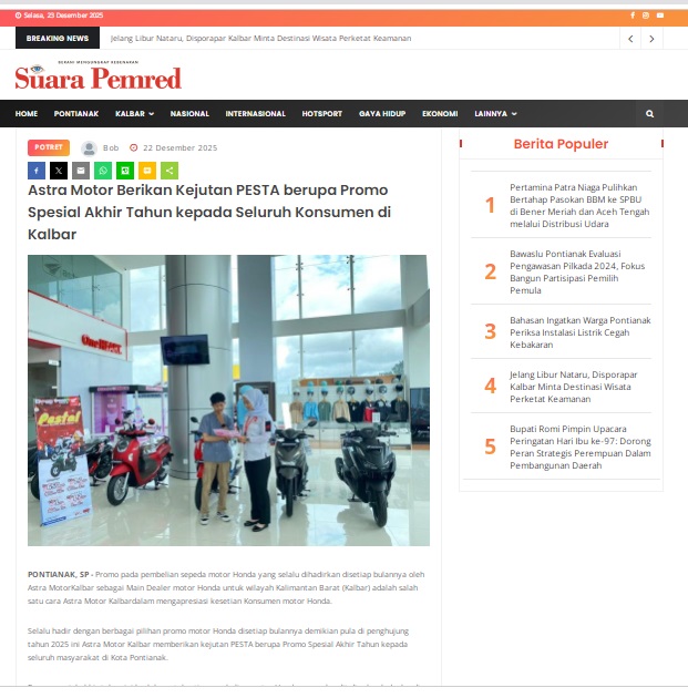 Astra Motor Berikan Kejutan PESTA berupa Promo Spesial Akhir Tahun kepada Seluruh Konsumen di Kalbar by masmul 22 Desember 2025 in Silahkan kunjungi https://www.suarapemredkalbar.com/read/potret/22122025/astra-motor-berikan-kejutan-pesta-berupa-promo-spesial-akhir-tahun-kepada-seluruh-konsumen-di-kalbar. You Might Like Regional Public Launching New ADV160 The SUV Pride Grand Launching New PCX 160 Truly Exceptional! Tetap hati-hati ya bro sist berkendara saat hujan.