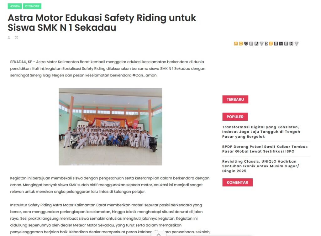 Astra Motor Edukasi Safety Riding untuk Siswa SMK N 1 Sekadau by Muhammad Arif 22 Agustus 2025 in Silahkan kunjungi https://www.kapuaspost.web.id/2025/08/astra-motor-edukasi-safety-riding-untuk_22.html. Tags: astra Astra Motor kalbar Astra Motor Pontianak astramotor honda kalbar pontianak sepeda motor You Might Like Regional Public Launching New ADV160 The SUV Pride Grand Launching New PCX 160 Truly Exceptional! Tetap hati-hati ya bro sist berkendara saat hujan.