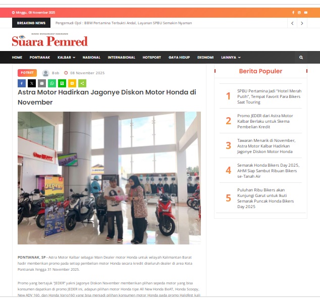 Astra Motor Hadirkan Jagonye Diskon Motor Honda di November by masmul 8 November 2025 in Silahkan kunjungi https://www.suarapemredkalbar.com/read/potret/08112025/astra-motor-hadirkan-jagonye-diskon-motor-honda-di-november. You Might Like Regional Public Launching New ADV160 The SUV Pride Grand Launching New PCX 160 Truly Exceptional! Tetap hati-hati ya bro sist berkendara saat hujan.