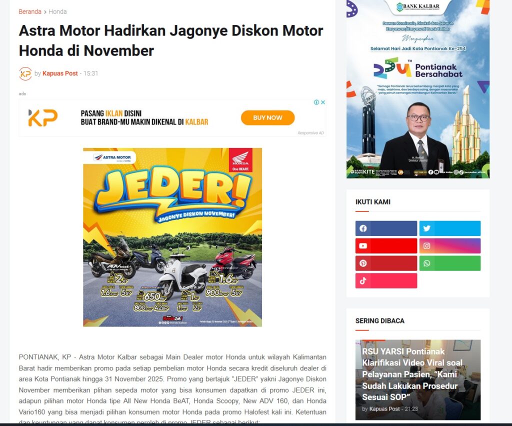 Astra Motor Hadirkan Jagonye Diskon Motor Honda di November by Muhammad Arif 8 November 2025 in Silahkan kunjungi https://www.kapuaspost.web.id/2025/11/astra-motor-hadirkan-jagonye-diskon.html. Tags: astra Astra Motor kalbar Astra Motor Pontianak astramotor honda kalbar pontianak sepeda motor You Might Like Regional Public Launching New ADV160 The SUV Pride Grand Launching New PCX 160 Truly Exceptional! Tetap hati-hati ya bro sist berkendara saat hujan.
