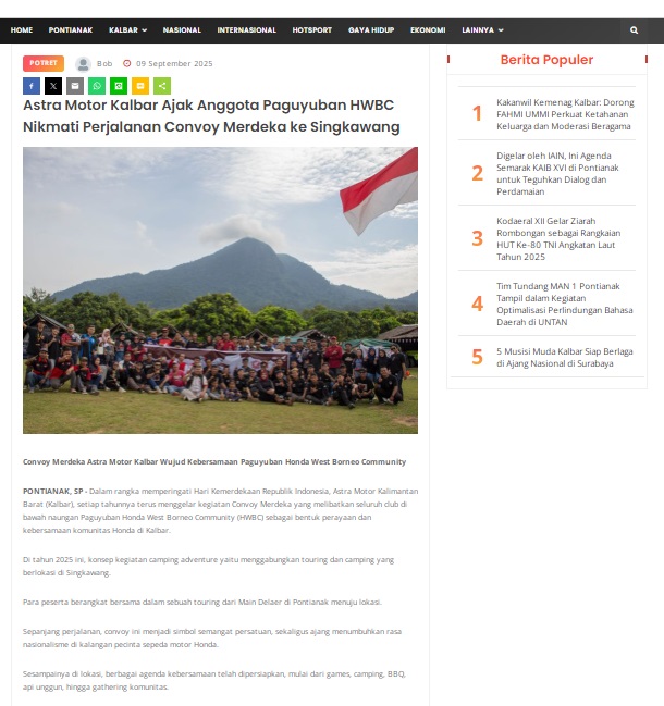 Astra Motor Kalbar Ajak Anggota Paguyuban HWBC Nikmati Perjalanan Convoy Merdeka ke Singkawang by masmul 9 September 2025 in Silahkan kunjungi https://www.suarapemredkalbar.com/read/potret/09092025/astra-motor-kalbar-ajak-anggota-paguyuban-hwbc-nikmati-perjalanan-convoy-merdeka-ke-singkawang. You Might Like Regional Public Launching New ADV160 The SUV Pride Grand Launching New PCX 160 Truly Exceptional! Tetap hati-hati ya bro sist berkendara saat hujan.