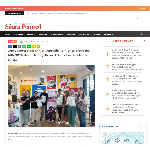 Astra Motor Kalbar Ajak Jurnalis Pontianak Rayakan HPN 2026, Gelar Safety Riding Education dan Servis Gratis by masmul 24 Februari 2026 in Silahkan kunjungi https://www.suarapemredkalbar.com/read/potret/24022026/astra-motor-kalbar-ajak-jurnalis-pontianak-rayakan-hpn-2026-gelar-safety-riding-education-dan-servis-gratis. You Might Like Regional Public Launching New ADV160 The SUV Pride Grand Launching New PCX 160 Truly Exceptional! Tetap hati-hati ya bro sist berkendara saat hujan.
