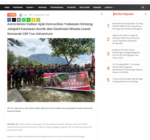 Astra Motor Kalbar Ajak Komunitas Trabasan Sintang Jelajahi Kawasan Ikonik dan Destinasi Wisata Lewat Semarak CRF Fun Adventure by masmul 10 September 2025 in Silahkan kunjungi https://www.suarapemredkalbar.com/read/potret/10092025/astra-motor-kalbar-ajak-komunitas-trabasan-sintang-jelajahi-kawasan-ikonik-dan-destinasi-wisata-lewat-semarak-crf-fun-adventure. You Might Like Regional Public Launching New ADV160 The SUV Pride Grand Launching New PCX 160 Truly Exceptional! Tetap hati-hati ya bro sist berkendara saat hujan.