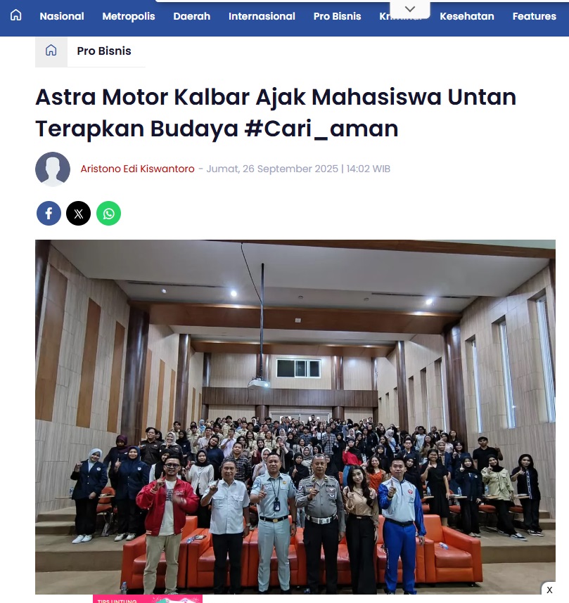 Astra Motor Kalbar Ajak Mahasiswa Untan Terapkan Budaya #Cari_aman by Aristono Edi Kiswantoro 26 September 2025 in Silahkan kunjungi https://pontianakpost.jawapos.com/pro-bisnis/1466624879/astra-motor-kalbar-ajak-mahasiswa-untan-terapkan-budaya-cari_aman. You Might Like Regional Public Launching New ADV160 The SUV Pride Grand Launching New PCX 160 Truly Exceptional! Tetap hati-hati ya bro sist berkendara saat hujan.