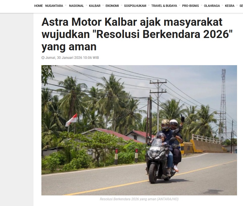 Astra Motor Kalbar ajak masyarakat wujudkan “Resolusi Berkendara 2026” yang aman by Dedi 30 Januari 2026 in Silahkan kunjungi https://kalbar.antaranews.com/berita/686690/astra-motor-kalbar-ajak-masyarakat-wujudkan-resolusi-berkendara-2026-yang-aman. You Might Like Regional Public Launching New ADV160 The SUV Pride Grand Launching New PCX 160 Truly Exceptional! Tetap hati-hati ya bro sist berkendara saat hujan.