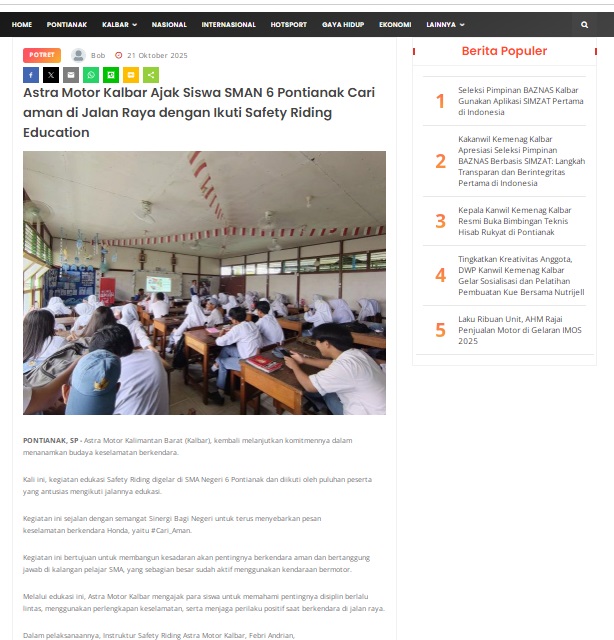 Astra Motor Kalbar Ajak Siswa SMAN 6 Pontianak Cari aman di Jalan Raya dengan Ikuti Safety Riding Education by masmul 21 Oktober 2025 in Silahkan kunjungi https://www.suarapemredkalbar.com/read/potret/21102025/astra-motor-kalbar-ajak-siswa-sman-6-pontianak-cari-aman-di-jalan-raya-dengan-ikuti-safety-riding-education. You Might Like Regional Public Launching New ADV160 The SUV Pride Grand Launching New PCX 160 Truly Exceptional! Tetap hati-hati ya bro sist berkendara saat hujan.