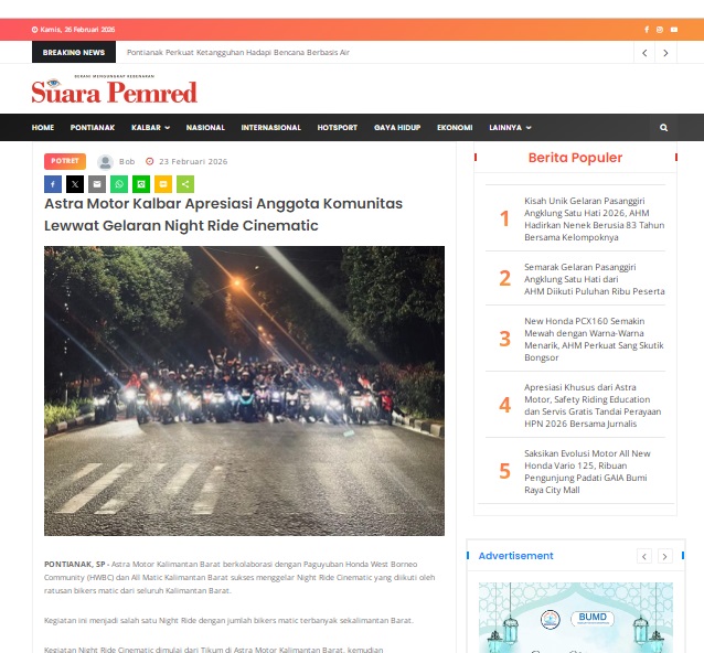 Astra Motor Kalbar Apresiasi Anggota Komunitas Lewwat Gelaran Night Ride Cinematic by masmul 23 Februari 2026 in Silahkan kunjungi https://www.suarapemredkalbar.com/read/potret/23022026/astra-motor-kalbar-apresiasi-anggota-komunitas-lewwat-gelaran-night-ride-cinematic. You Might Like Regional Public Launching New ADV160 The SUV Pride Grand Launching New PCX 160 Truly Exceptional! Tetap hati-hati ya bro sist berkendara saat hujan.