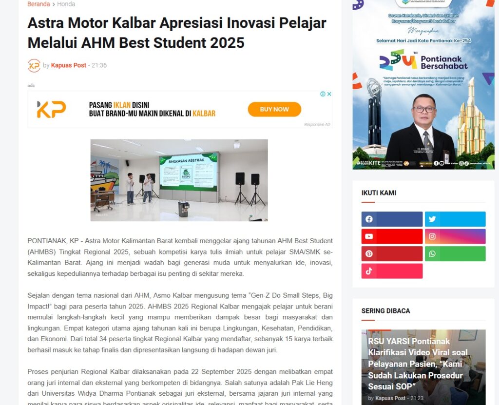 Astra Motor Kalbar Apresiasi Inovasi Pelajar Melalui AHM Best Student 2025 by Muhammad Arif 21 Oktober 2025 in Silahkan kunjungi https://www.kapuaspost.web.id/2025/10/astra-motor-kalbar-apresiasi-inovasi.html. Tags: astra Astra Motor kalbar Astra Motor Pontianak astramotor honda kalbar pontianak sepeda motor You Might Like Regional Public Launching New ADV160 The SUV Pride Grand Launching New PCX 160 Truly Exceptional! Tetap hati-hati ya bro sist berkendara saat hujan.