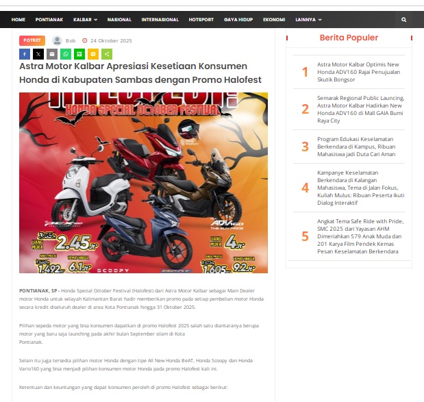 Astra Motor Kalbar Apresiasi Kesetiaan Konsumen Honda di Kabupaten Sambas dengan Promo Halofest by masmul 24 Oktober 2025 in Silahkan kunjungi https://www.suarapemredkalbar.com/read/potret/24102025/astra-motor-kalbar-apresiasi-kesetiaan-konsumen-honda-di-kabupaten-sambas-dengan-promo-halofest. You Might Like Regional Public Launching New ADV160 The SUV Pride Grand Launching New PCX 160 Truly Exceptional! Tetap hati-hati ya bro sist berkendara saat hujan.