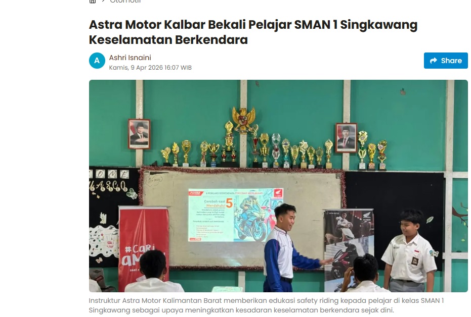 Astra Motor Kalbar Bekali Pelajar SMAN 1 Singkawang Keselamatan Berkendara by Aristono Edi Kiswantoro 9 April 2026 in Silahkan kunjungi https://pontianakpost.jawapos.com/otomotif/2604090055/astra-motor-kalbar-bekali-pelajar-sman-1-singkawang-keselamatan-berkendara. You Might Like Regional Public Launching New ADV160 The SUV Pride Grand Launching New PCX 160 Truly Exceptional! Tetap hati-hati ya bro sist berkendara saat hujan.