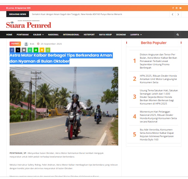 Astra Motor Kalbar Berbagai Tips Berkendara Aman dan Nyaman di Bulan Oktober by masmul 25 September 2025 in Silahkan kunjungi https://www.suarapemredkalbar.com/read/potret/25092025/astra-motor-kalbar-berbagai-tips-berkendara-aman-dan-nyaman-di-bulan-oktober. You Might Like Regional Public Launching New ADV160 The SUV Pride Grand Launching New PCX 160 Truly Exceptional! Tetap hati-hati ya bro sist berkendara saat hujan.
